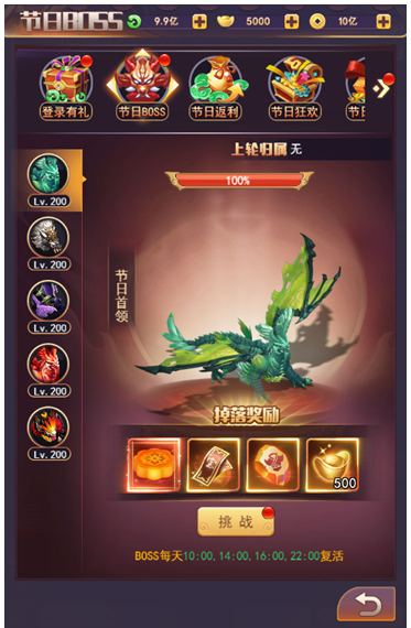 1、节日BOSS共5只,每天的10:00、14:00、17:00、22:00固定同时刷新;
